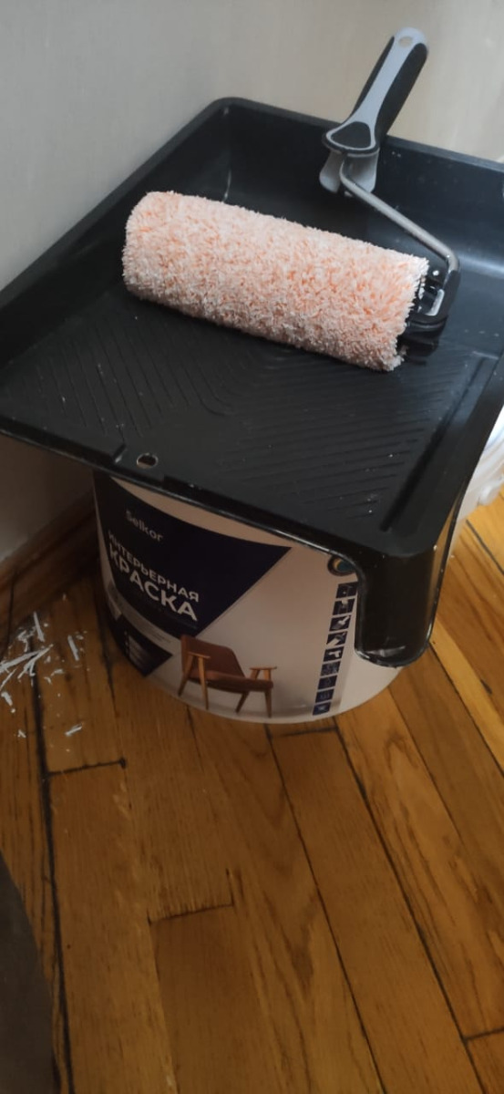 Нанесение валиком: Для гладких поверхностей и потолка рекомендуем использовать валик с коротким ворсом 0,8-0,95 см, для негладких/фактурных поверхностей — валик с длинным ворсом 1,5 см для того, чтобы неровности были равномерно прокрашены. Используя валик и кювету, необходимо наносить краску на поверхность способом раскатывания